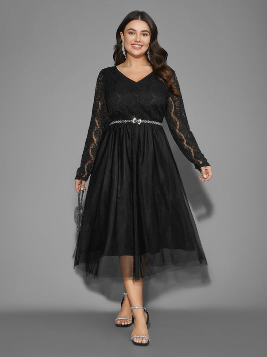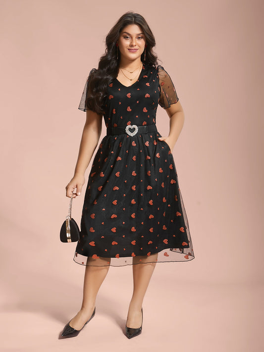 Hearts Mesh Sheer Sleeve Gathered Dress