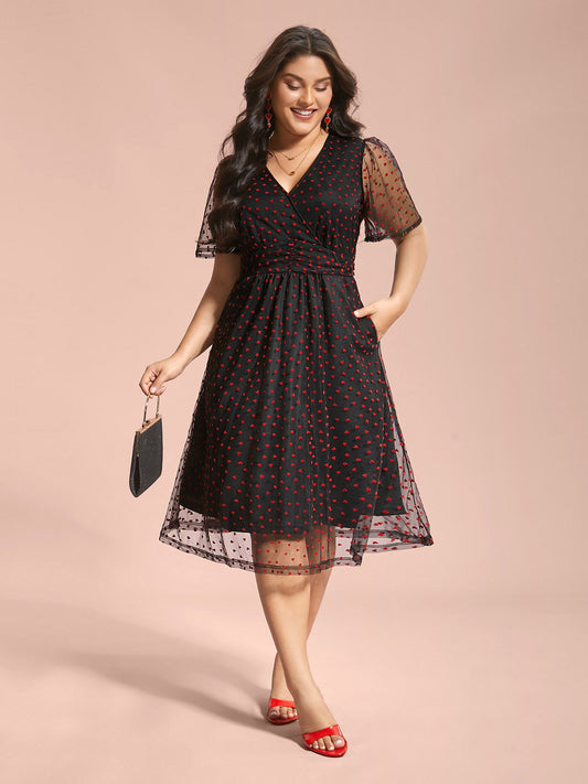V-Neck Flutter Sleeve Heart Pattern Midi Dress