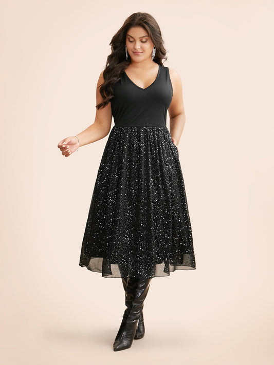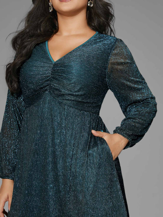 Plain Glitter Shirred Raglan Sleeve Mesh Pocket Ruffles Dress