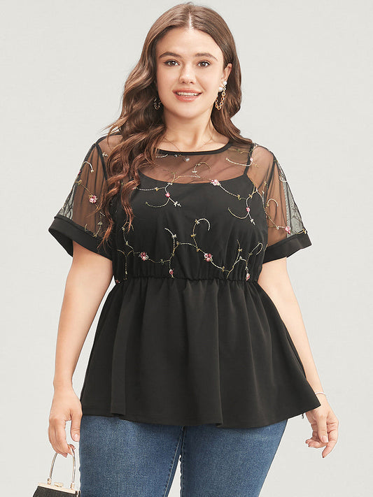 Floral Embroidered Mesh Patchwork Ruffles Blouse