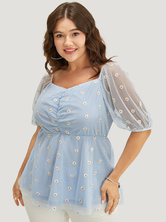 Daisy Floral Ruched Mesh Puff Sleeve Blouse