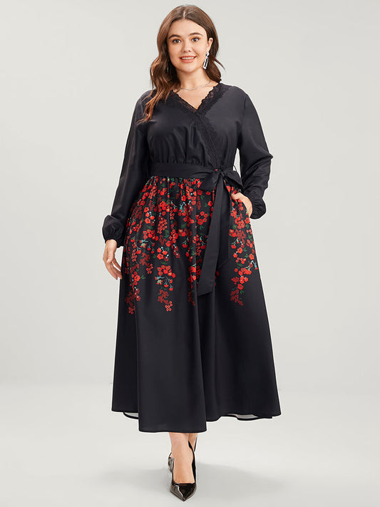 Floral Lace Surplice Neck Pocket Lantern Sleeve Belted Maxi Dress