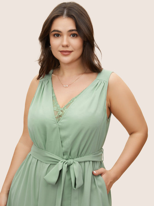 Lace Panel Split Front Sleeveless Belted Dress