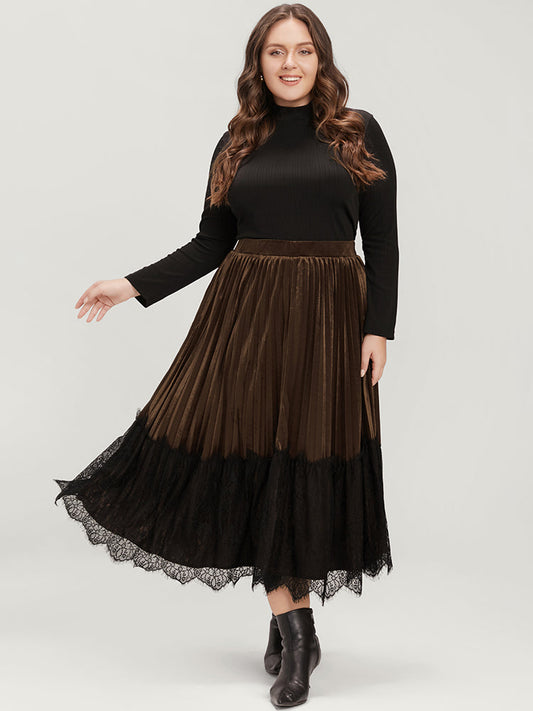 Colorblock Contrast Elastic Waist Lace Hem Velvet Pleated Skirt