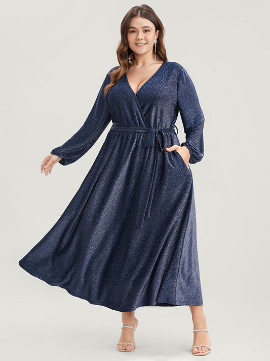 Solid Belted Pocket Glitter Wrap Flutter Maxi Dress
