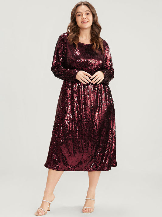 Solid Sequin Mesh Lantern Sleeve Surplice Neck Belted Dress