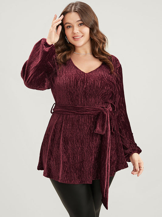 Glitter Textured Lantern Sleeve Belted Ruffle Blouse
