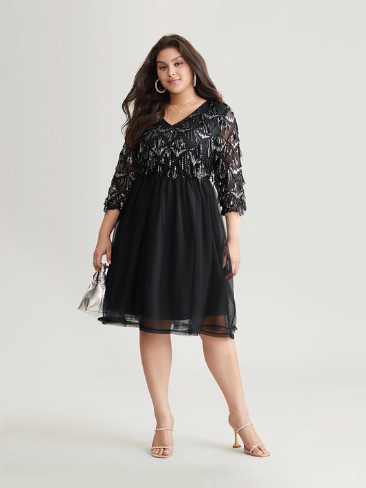 Sequin Patchwork Mesh Overlap Collar Dress