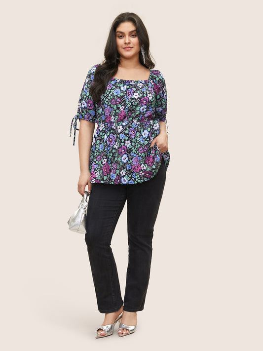 Floral Print Bowknot Side Square Neck Blouse
