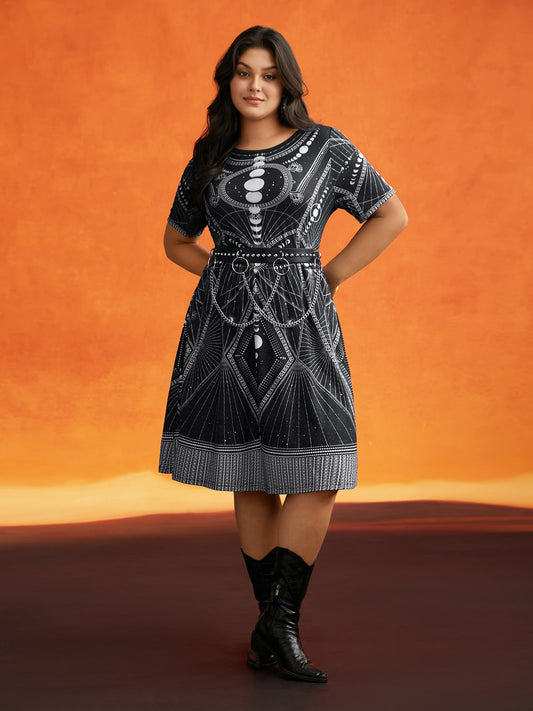 Neck Drawstring Bat Print Midi Dress