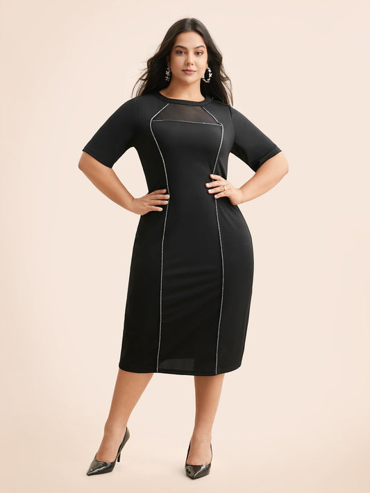 Crew Neck Rhinestone Patchwork Mesh Dress