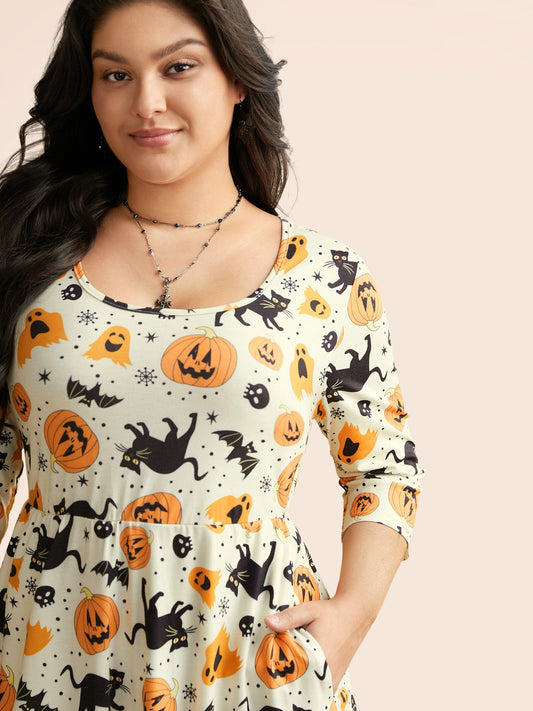 Pumpkin Spiced Elastic Waist Printed Midi Dress