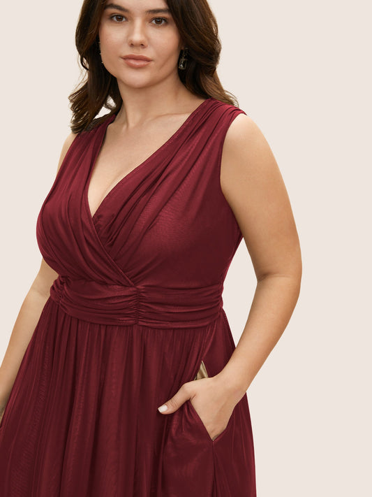 Overlap Collar Drawstring Mesh Cap Sleeve Jumpsuit