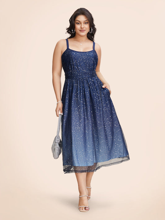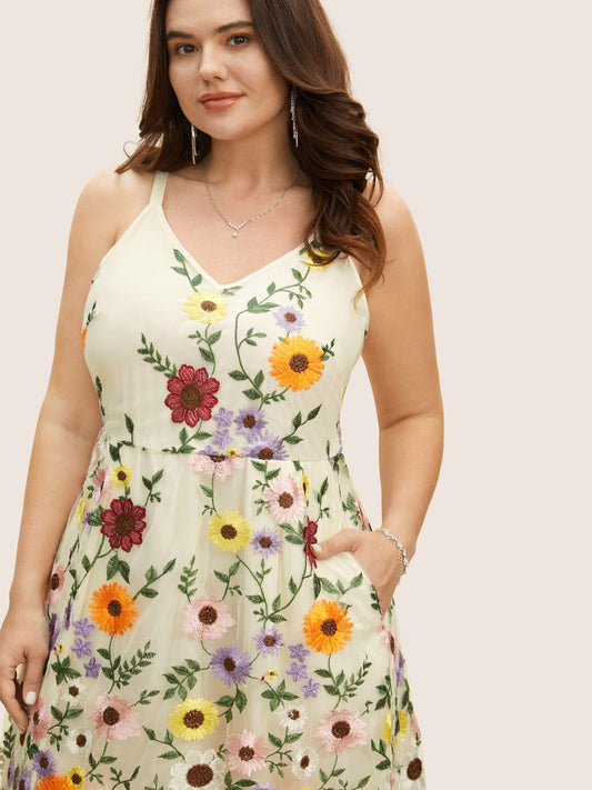 Heart Neckline Floral Embroidered Sequin Mesh Dress