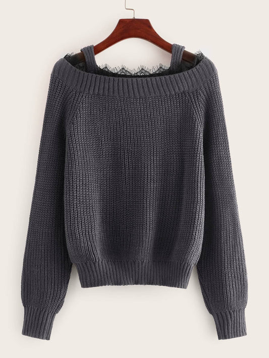 Cold Shoulder Contrast Lace Sweater