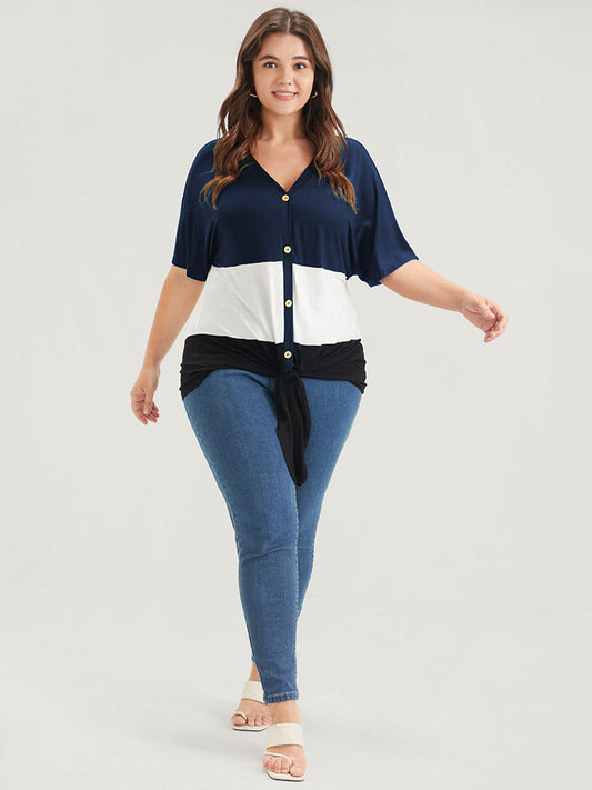 Colorblock Contrast Knotted Front Button Modal T-shirt
