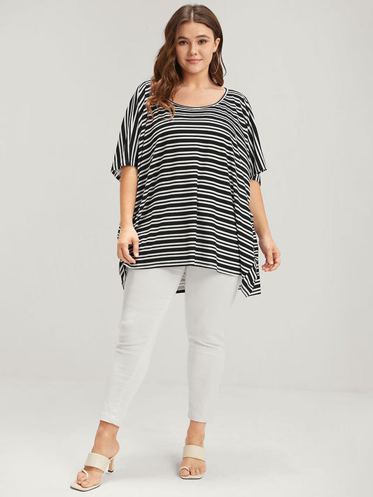 Round Neck Dolman Sleeve Asymmetrical Striped T-shirt