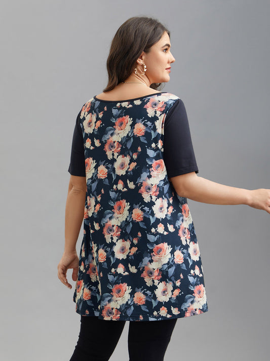 Round Neck Floral Print Patchwork Half Sleeve T-Shirt