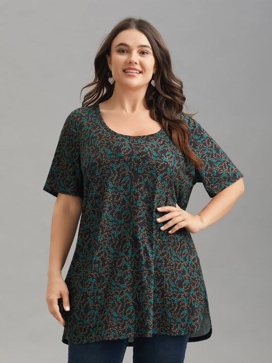 Floral Print Round Neck Slit T-Shirt