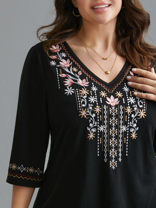 Floral Embroidered V-Neck T-shirt