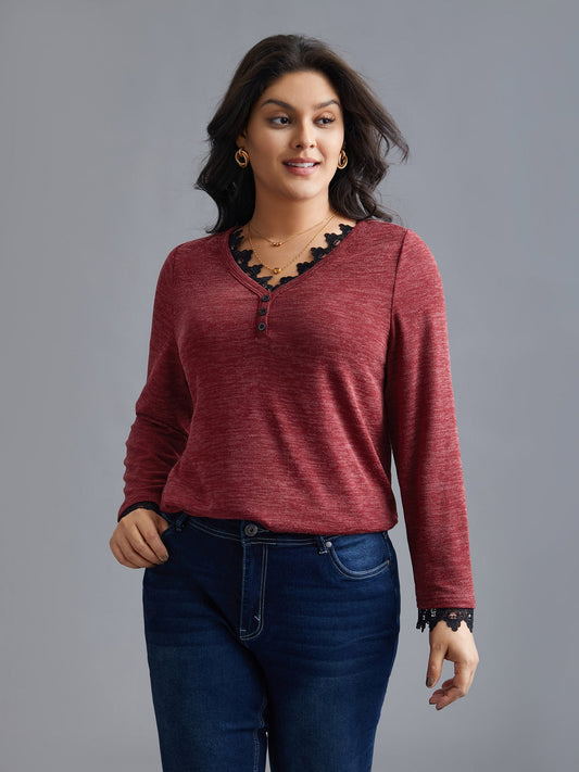 V Neck Lace Trim Stitch Button Detail T-Shirt