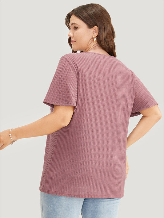 Solid Lace Button Detail Waffle Knit Ruffle Sleeve T-shirt