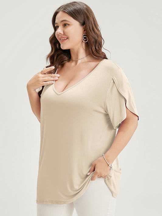 Plain V Neck Split Petal Sleeve T-shirt