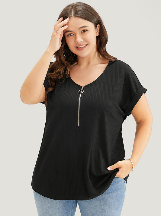 Plain Zipper Half Rib Knit Roll Dolman Sleeve T-shirt