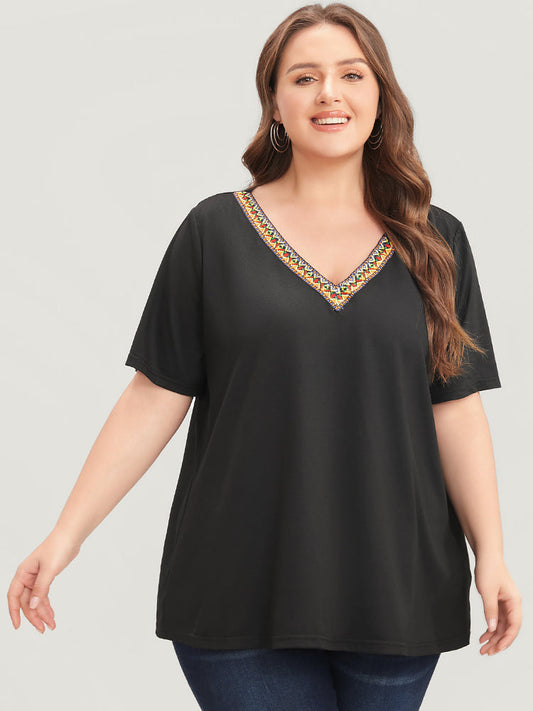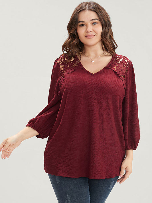 Solid V Neck Contrast Lace Lantern Sleeve T-shirt