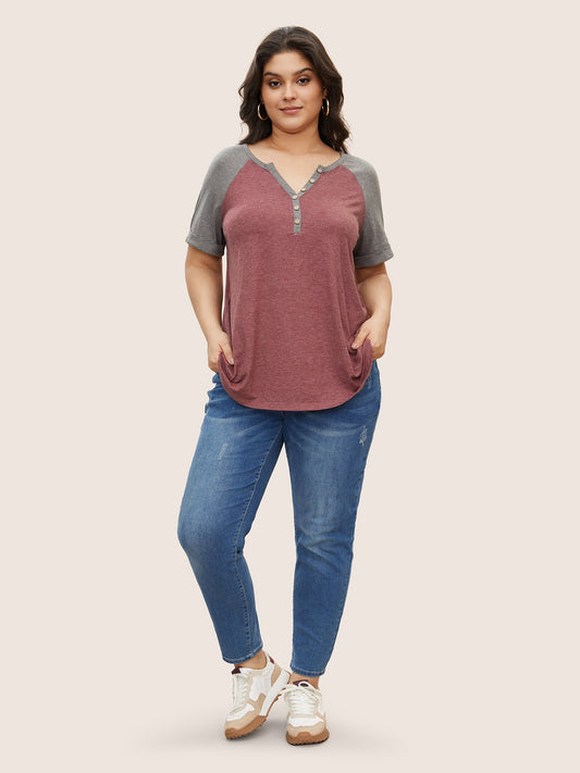 Colorblock Contrast Roll Raglan Sleeve Button Detail Notched T-shirt