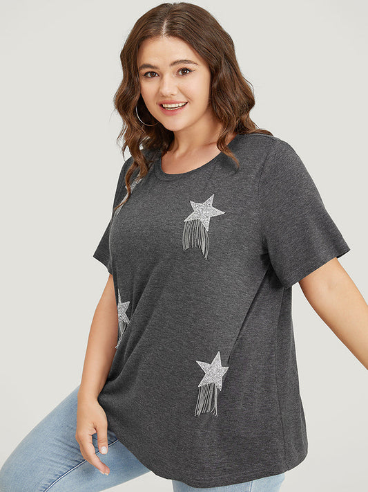 Star Embellished Fringe Hem Round Neck T-shirt