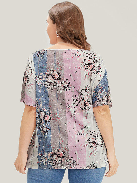 Floral Print Colorblock Contrast Split High Low Hem T-shirt