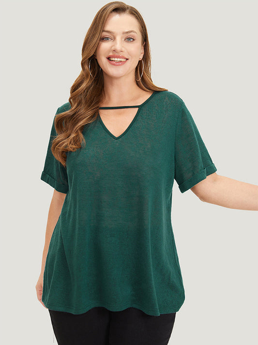 Solid Keyhole Mesh Cuffed Sleeve T-shirt