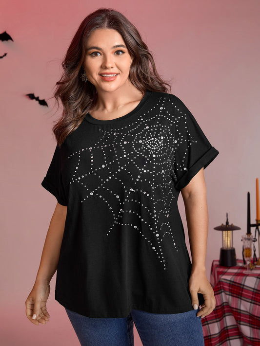 Spiderweb Rhinestone Stretchy Solid T-Shirt