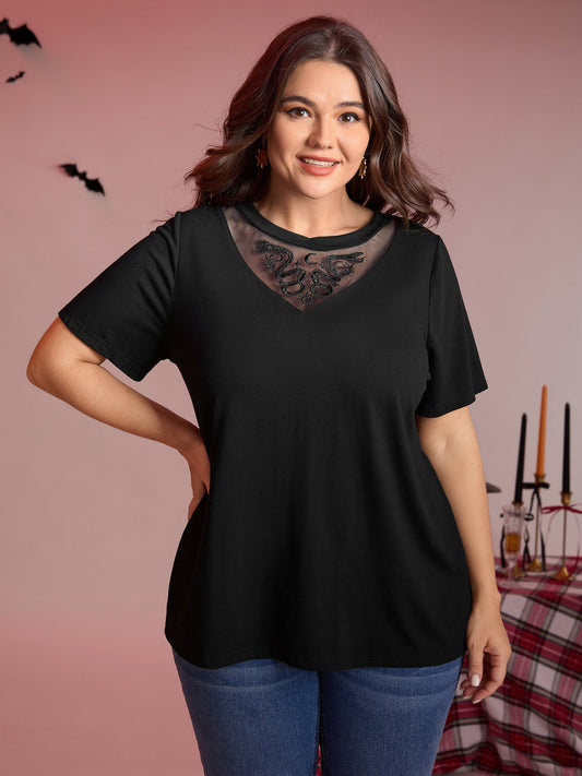 Stretch Embroidered Neckline Sheer T-Shirt