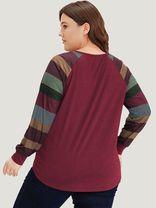 Colour Striped Patchwork Patched Pocket Raglan Sleeve T-shirt