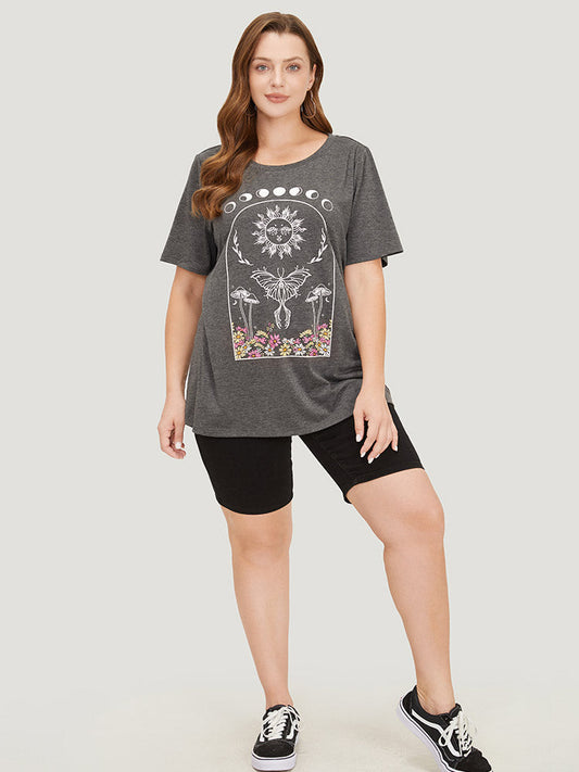 Butterfly & Moon Print Heather Graphic T-shirt