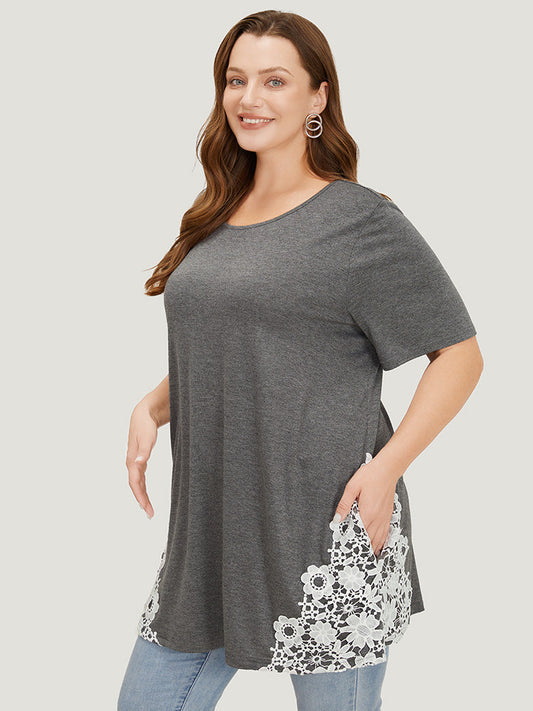 Plain Heather Crew Neck Guipure Lace T-shirt