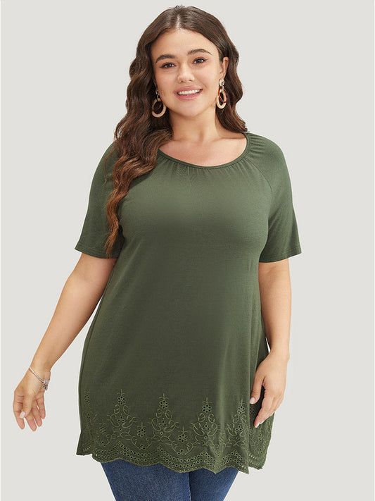 Plain Broderie Anglaise Raglan Sleeve Scalloped Front T-shirt