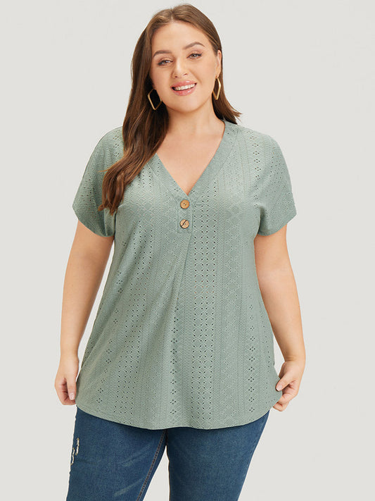 Solid Broderie Anglaise Dolman Sleeve Button Detail T-shirt