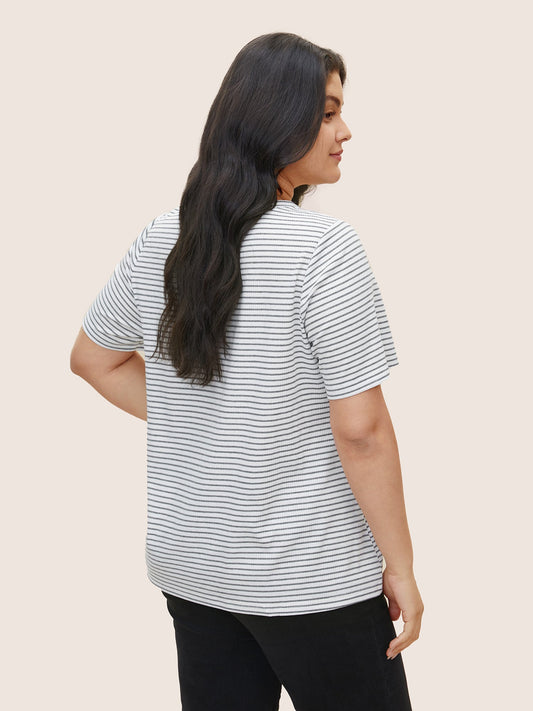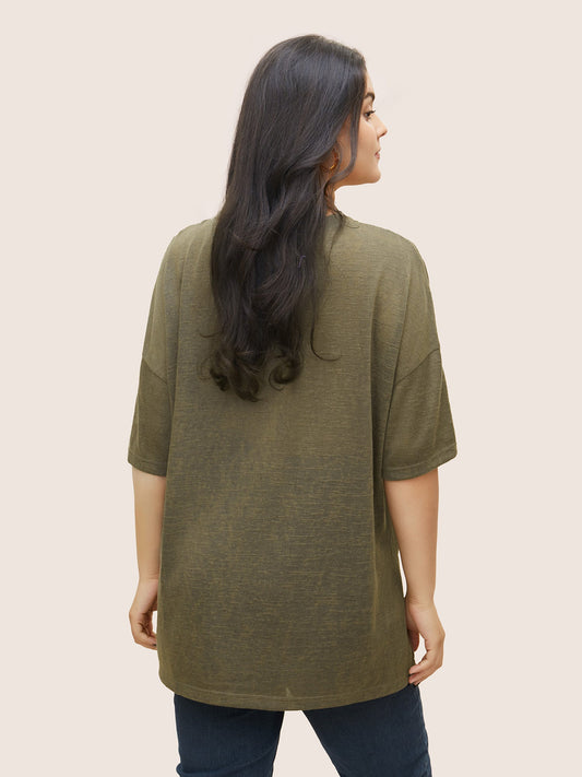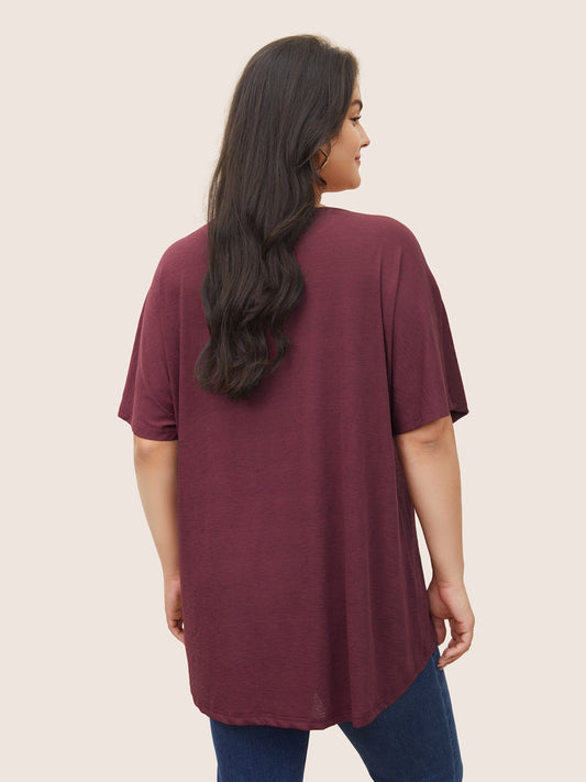 Solid Button Detail Rib Knit Arc Hem Long Tee
