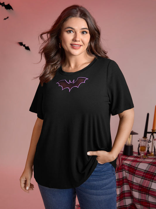 Bat Neck Cut-Out Stretchy Embroidered T-Shirt