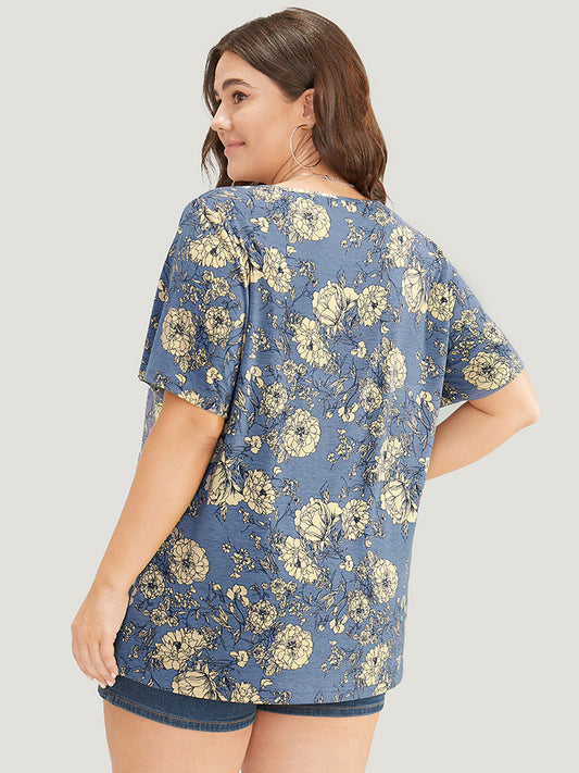 Striped Patchwork Asymmetrical Hem Floral Raglan Sleeve T-shirt