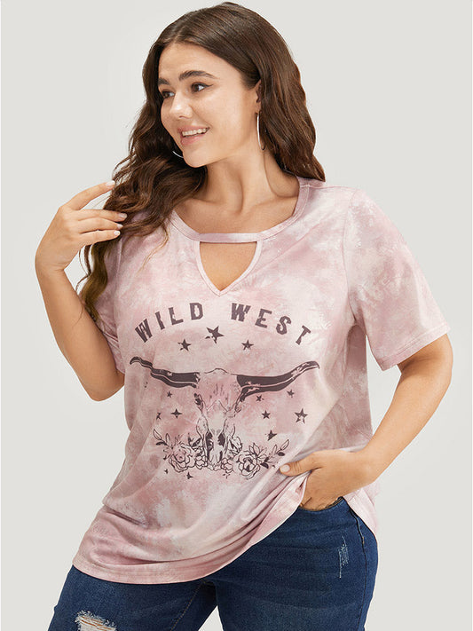 Letter & Star Print Keyhole Tie Dye T-shirt