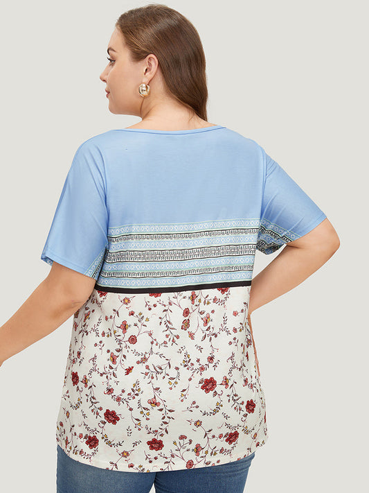 Floral & Striped Batwing Sleeve Contrast T-shirt