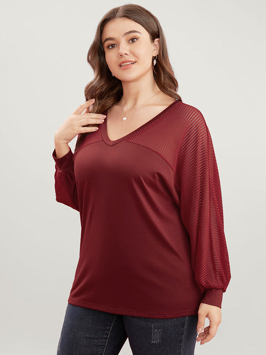 Striped Mesh Patchwork Dolman Sleeve V Neck Long Tee