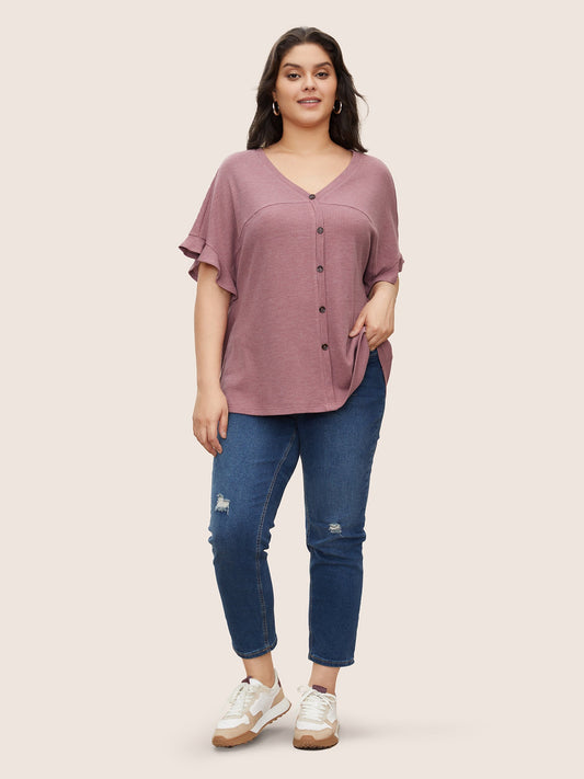 Waffle Knit Button Detail Ruffle Trim T-shirt