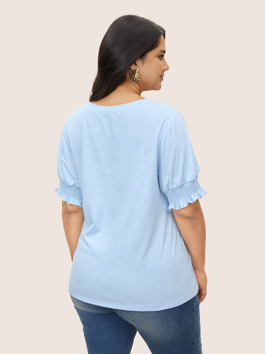 Round Neck Solid Shirred Puff Sleeve T-shirt