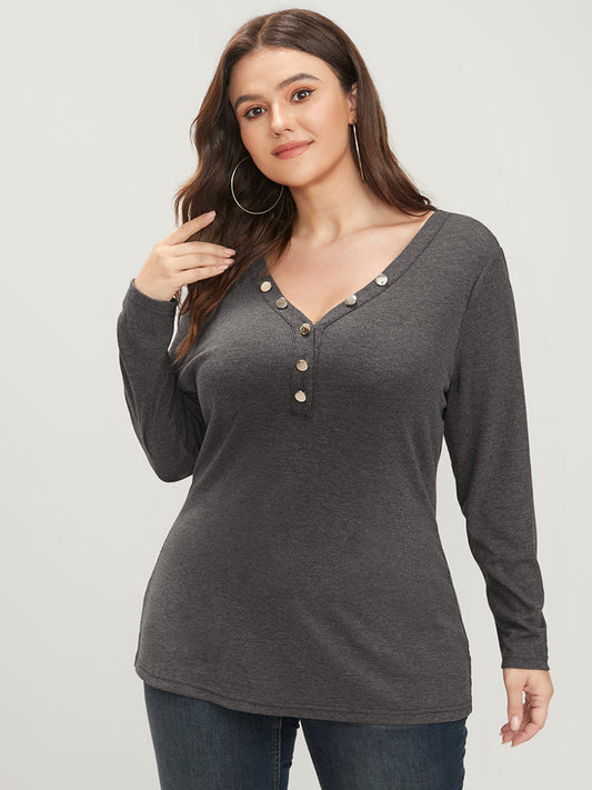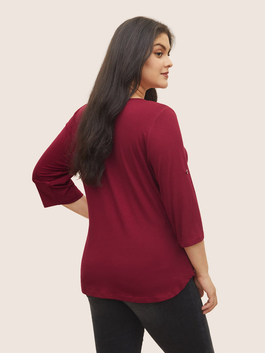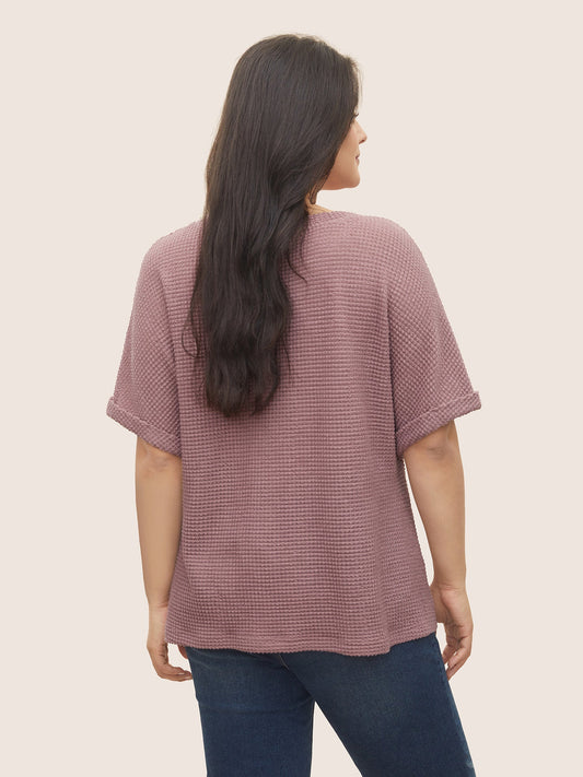 Plain Waffle Knit Button Detail Roll Sleeve T-shirt