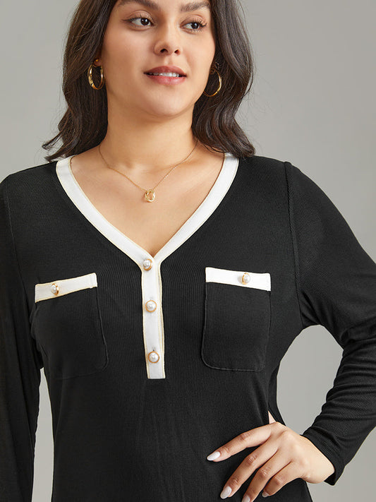 Two Tone Round Neck Button Detail T-shirt